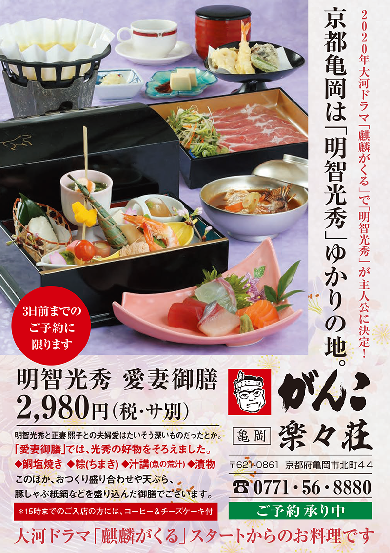 2020年大河ドラマ「麒麟がくる」で明智光秀が主人公に決定いたしました。京都亀岡は明智光秀ゆかりの地でございます。