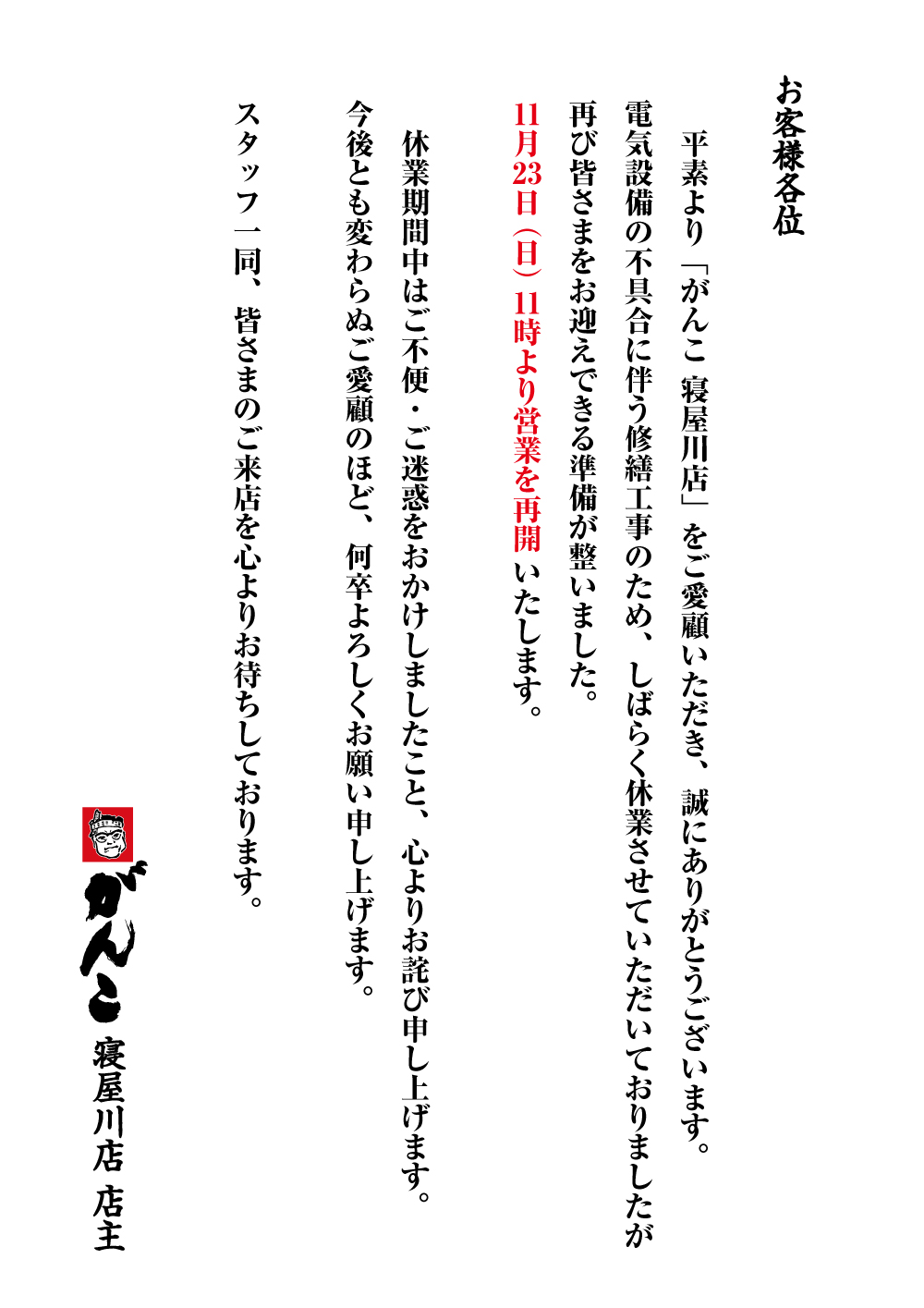 【寝屋川店】11/23(日)11:00〜 営業を再開いたします 店舗情報 2025/11/21 【寝屋川店】11/23(日)〜営業を再開いたします。 休業中はご不便をおかけしました。 皆さまのご来店を心よりお待ちしております。 前のページへ戻る